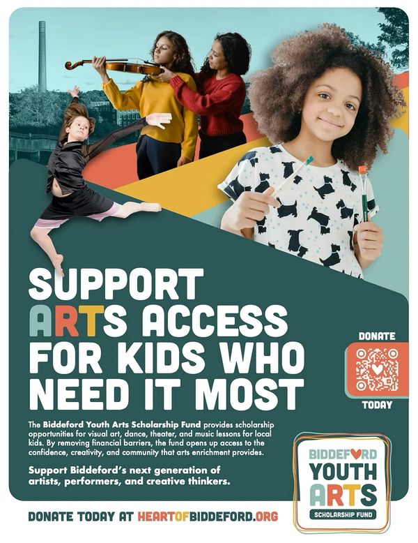Biddeford Youth Arts Scholarship fund (a Heart of Biddeford 501(c)(3) initiative) strives to remove financial barriers for children and youth eager to explore arts enrichment opportunities. Scholarships support visual art, dance, theater, and music lessons. Scholarships will cover tuition for community-based arts education in Biddeford, Maine.